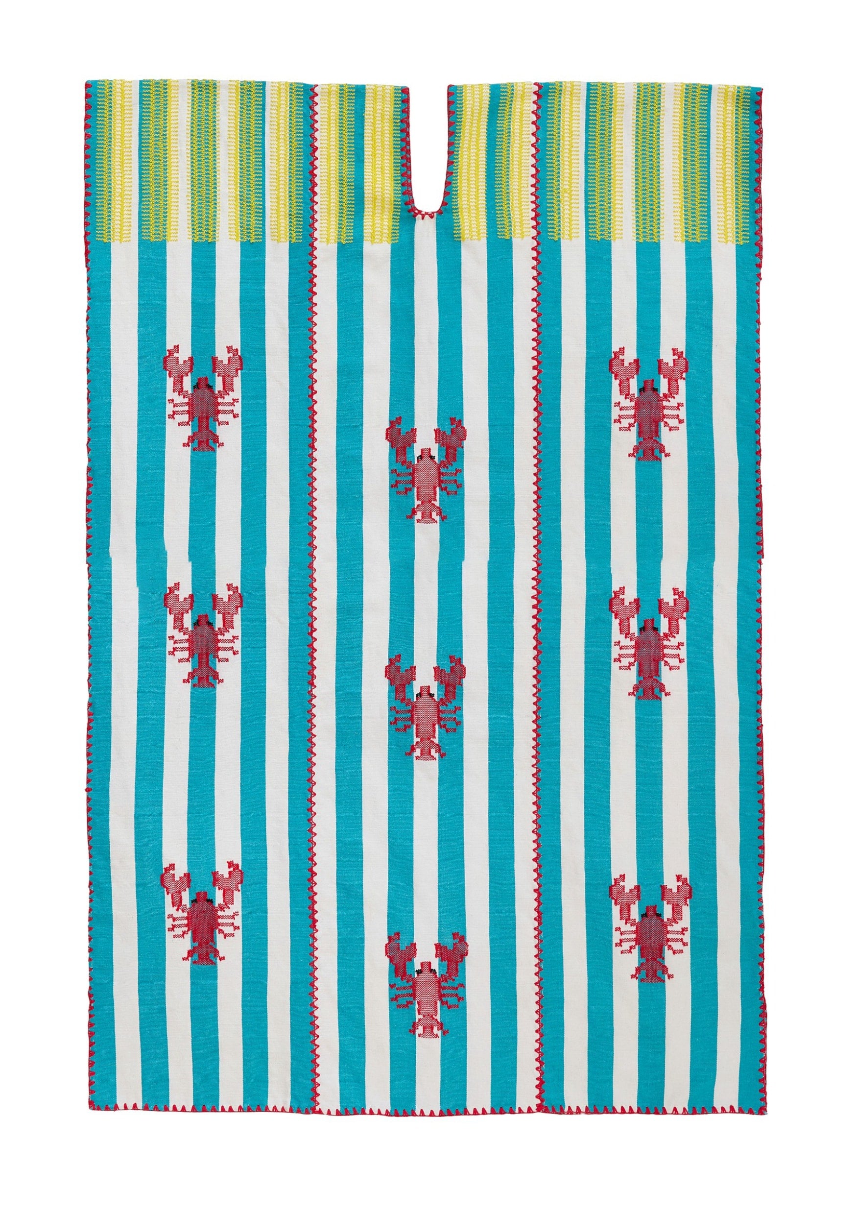 Three panel midi kaftan in blue and white stripes with red lobster and yellow shoulder design.