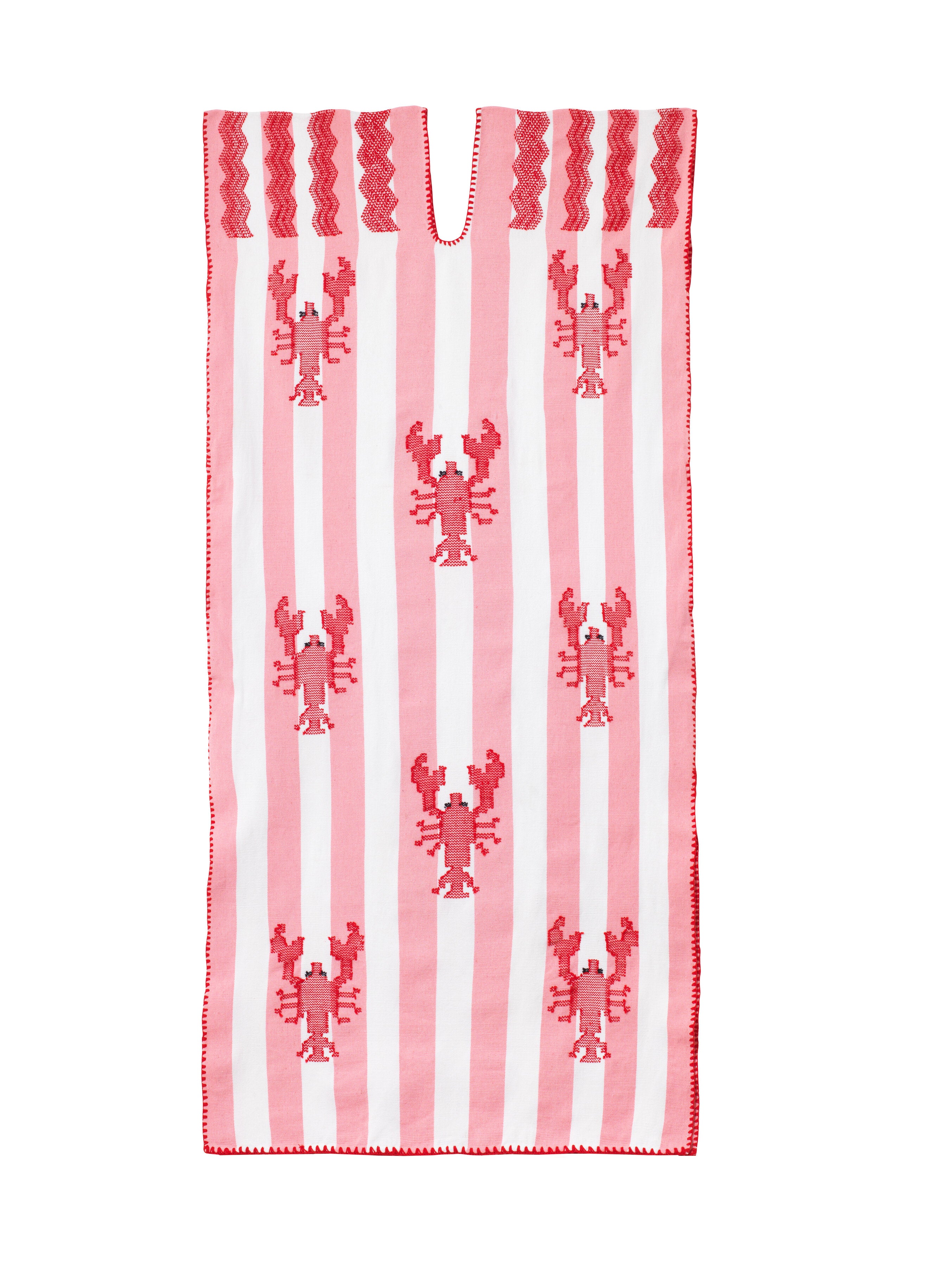 Single panel midi kaftan in pink and white stripes with red lobster design.